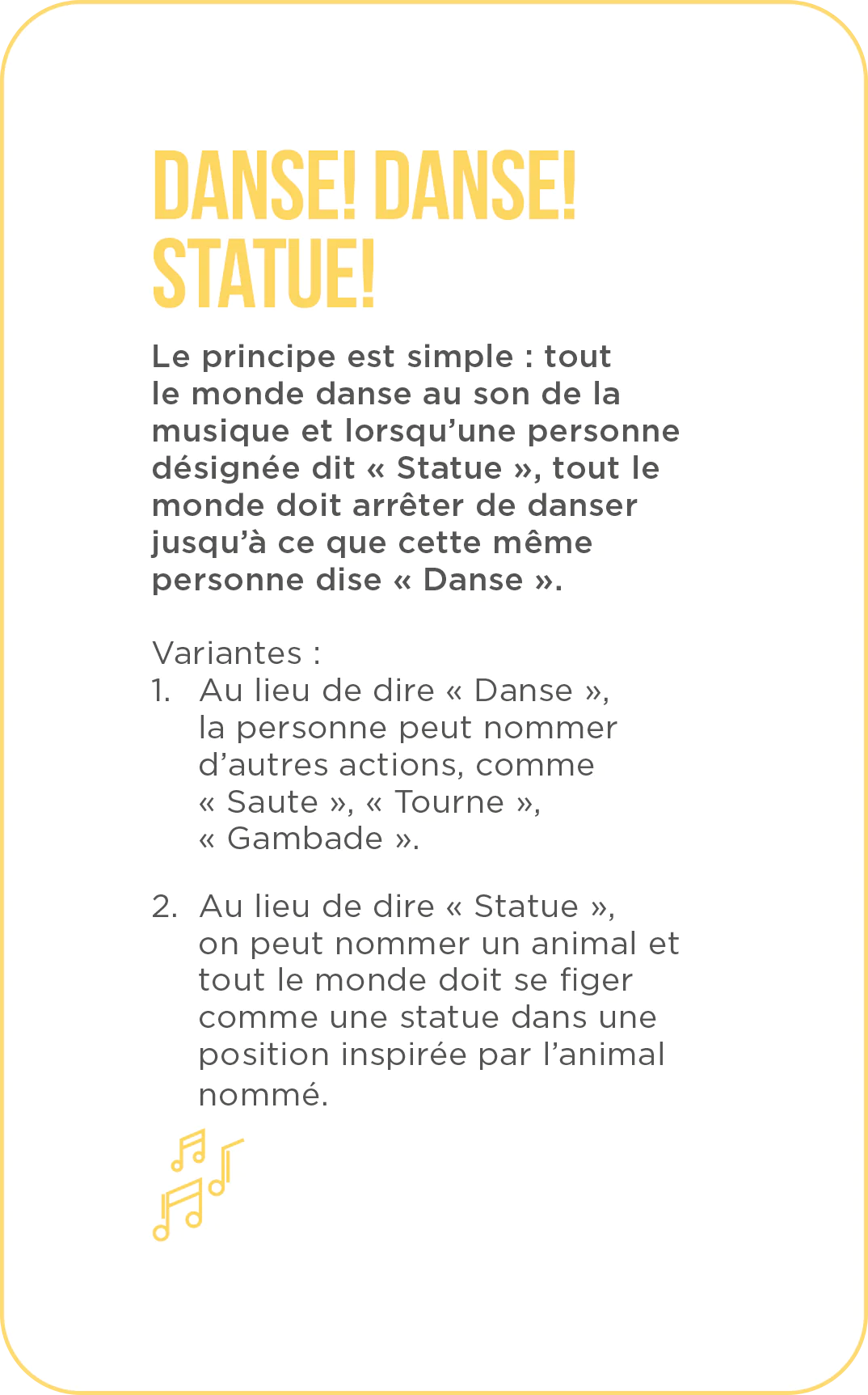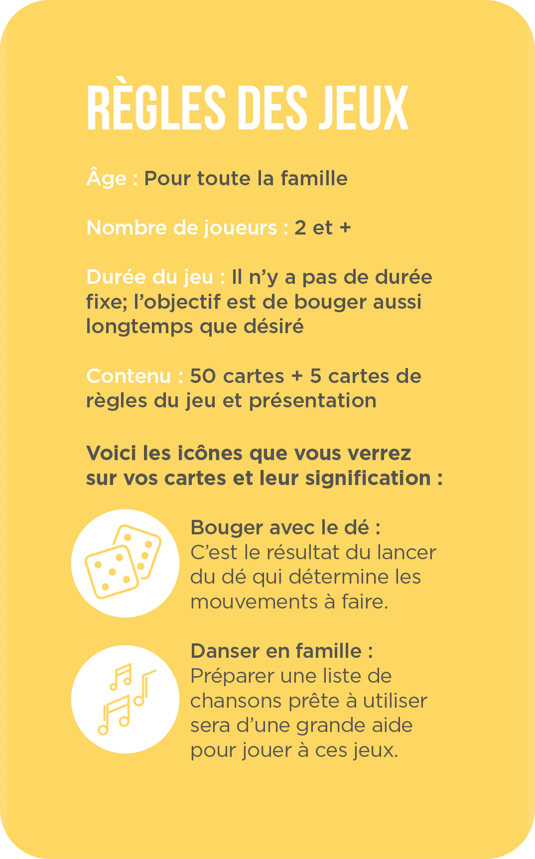 Contenu : 48 cartes d'activités. 2 cartes personnalisables pour créer vos propres jeux. 5 cartes de règles et de présentation