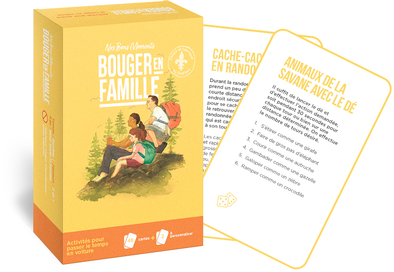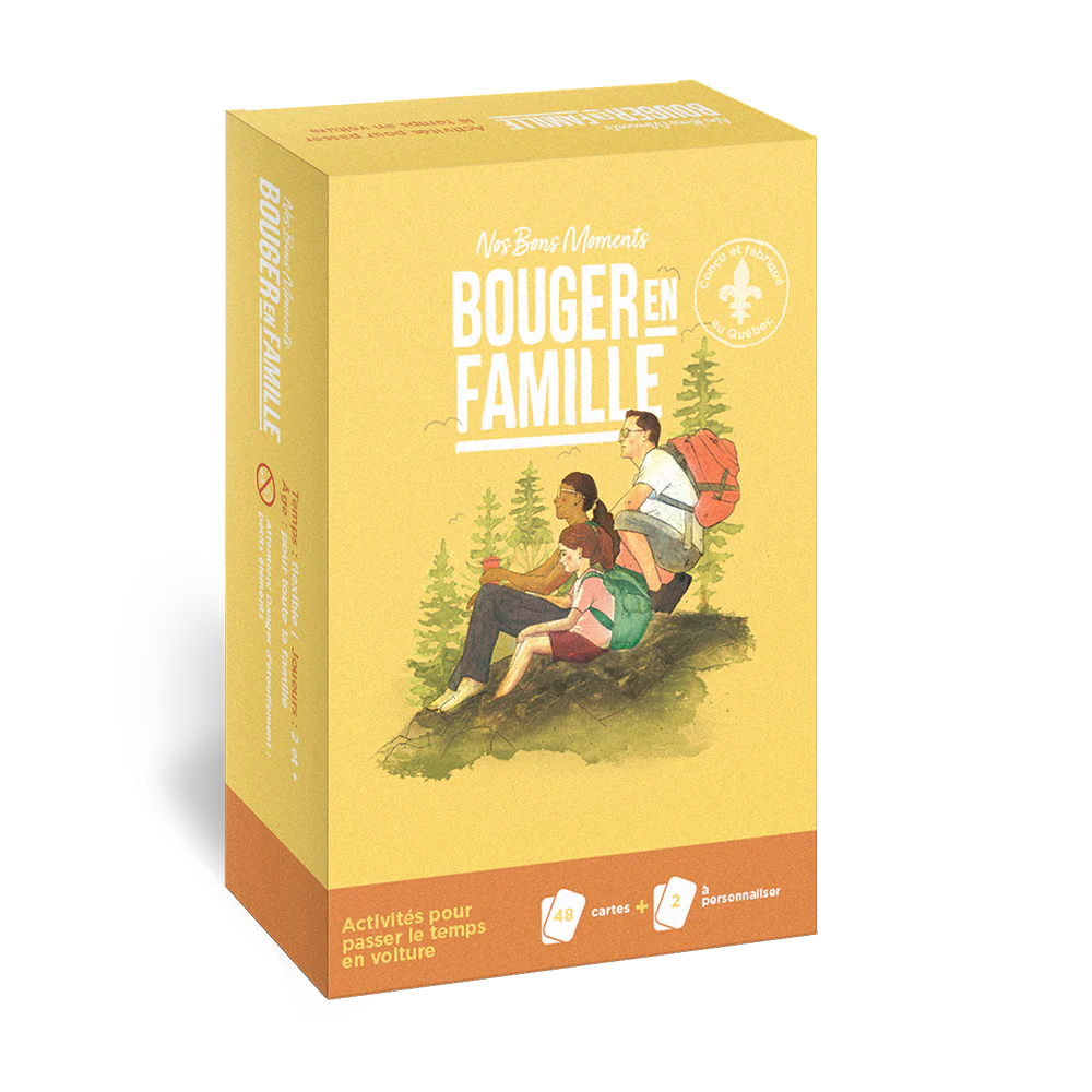 Le jeu bouger en famille - nos bons moments de Pomango est conçu pour encourager les familles à être actives ensemble grâce à 48 activités simples, amusantes et rapides. Que ce soit en plein air ou à la maison, chaque carte propose une nouvelle façon de s'amuser en famille.