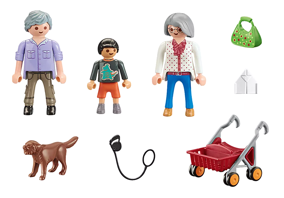 Le set grands-parents avec petit-fils Playmobil invite les enfants à recréer des moments de complicité intergénérationnelle. Les grands-parents partent en promenade avec leur petit-fils et leur chien, offrant une scène de vie quotidienne pleine de tendresse.