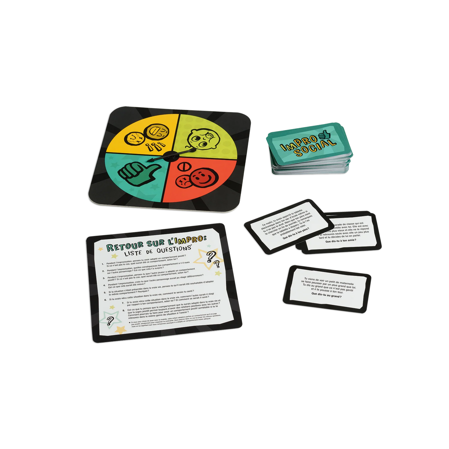 Le jeu éducatif ImProsocial de Placote est conçu pour aider les jeunes de 8 à 14 ans à développer leurs habiletés sociales à travers des mises en situation interactives. En utilisant une roulette, les joueurs sont invités à improviser des réactions de manière émotive, neutre, enfantine ou prosociale, stimulant ainsi la réflexion et l'adaptation comportementale. Ce jeu favorise la communication, l'empathie et la résolution de conflits, tout en offrant un cadre ludique pour aborder des situations du quotidien.