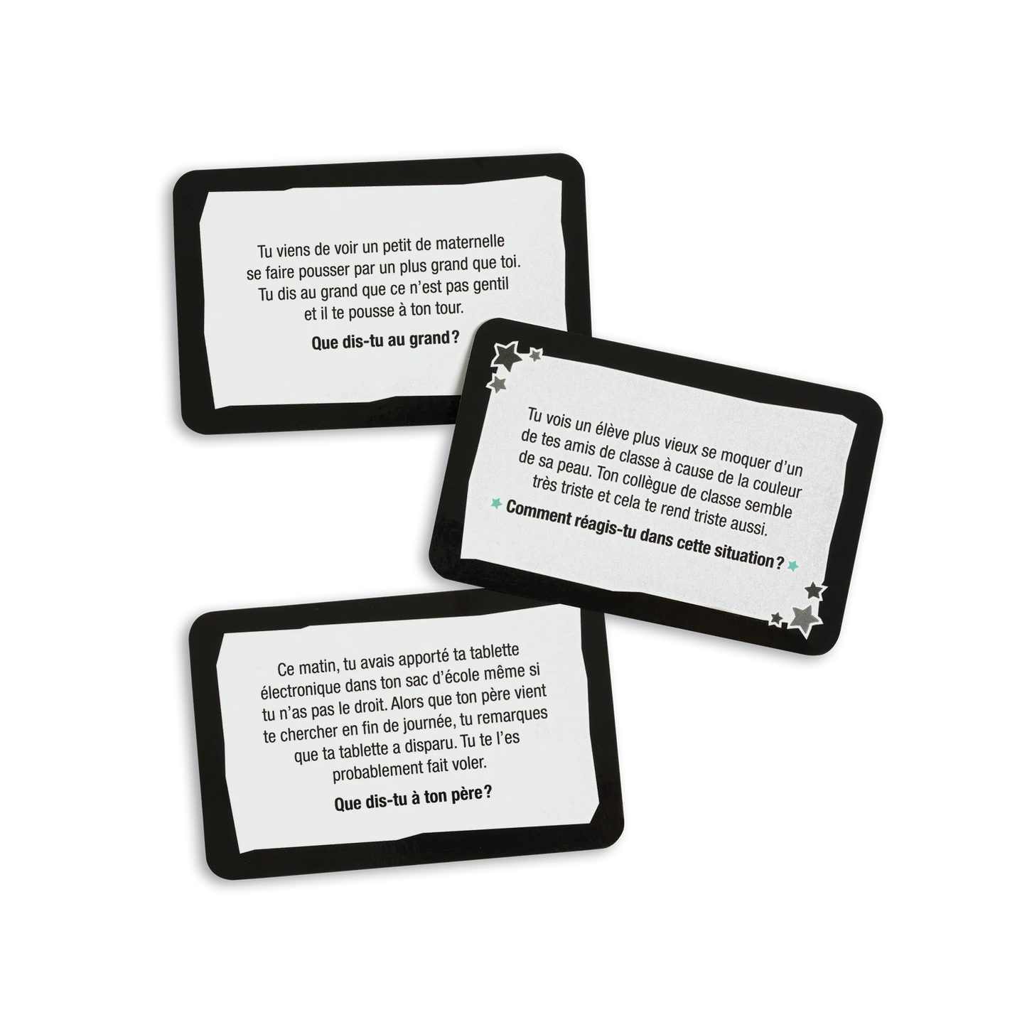Contenu : 85 cartes-situations. 15 cartes-situations spéciales. 1 roulette. 1 liste de questions. 1 guide d'accompagnement. Règles du jeu