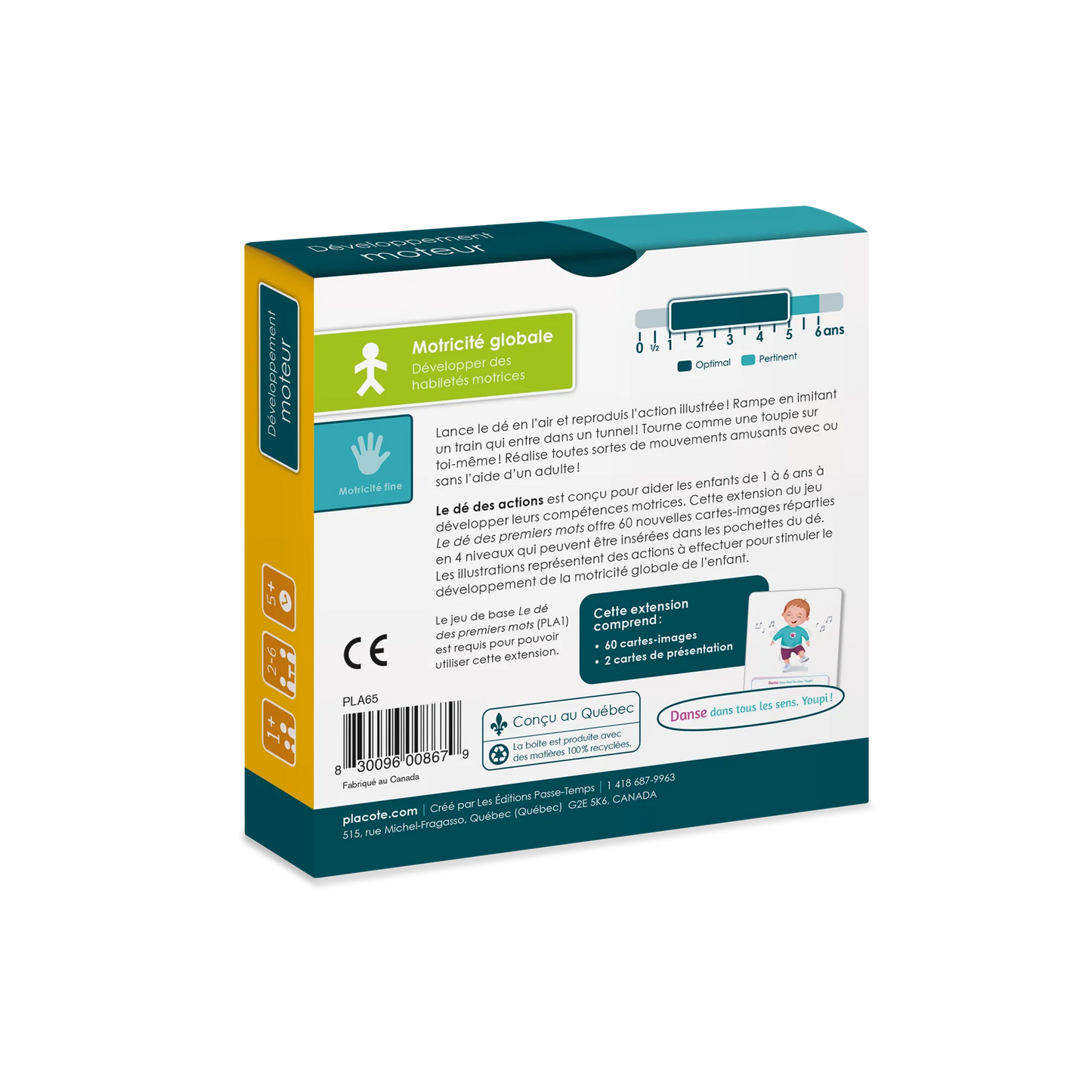 Cette extension du jeu le dé des premiers mots de Placote propose 60 nouvelles cartes illustrées réparties en 4 niveaux de difficulté, conçues pour stimuler la motricité globale des enfants. Les cartes présentent des actions amusantes à réaliser, telles que ramper, sauter ou marcher comme un animal, favorisant ainsi le développement des habiletés motrices. Le jeu encourage l'activité physique et l'apprentissage ludique, avec ou sans l'aide d'un adulte.