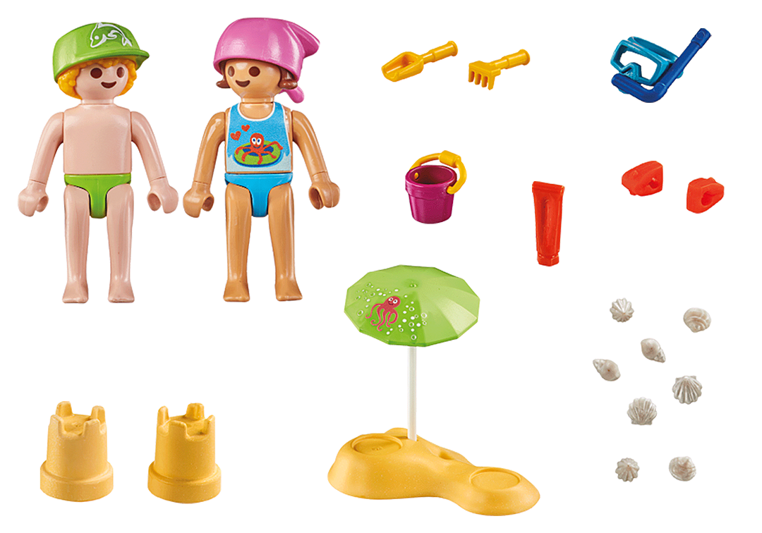 Contenu : 2 figurines d'enfants. 1 château de sable. 1 parasol. 1 seau. 1 pelle. 1 râteau. 1 crème solaire. 1 masque de plongée.1 chapeau. 1 bandana. Des coquillages