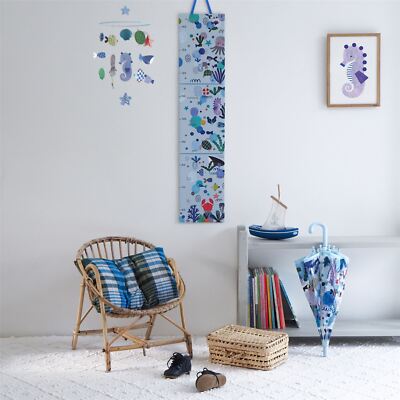 Dive into the underwater world with the Djeco Aquatic Life Height Chart, an enchanting wall decoration that measures your child's growth from 60 cm to 1.40 m. Adorned with shimmering illustrations with silver highlights, it transforms every inch you travel into an underwater adventure.