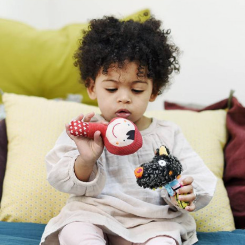 Soft maracas toys to stimulate babies from 9 months: a hybrid musical comforter, part rattle, part maraca, with a powerful bell designed for little hands. The “Louloup & Chaperon Rouge” universe tells an emotional story, ideal for reassuring and supporting musical development.