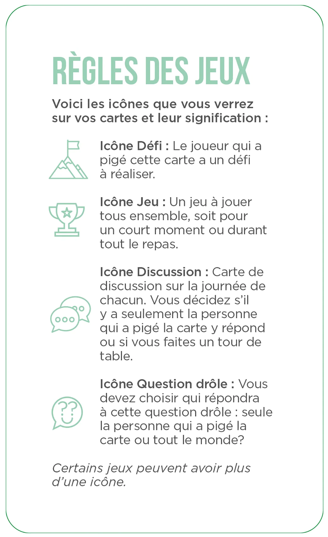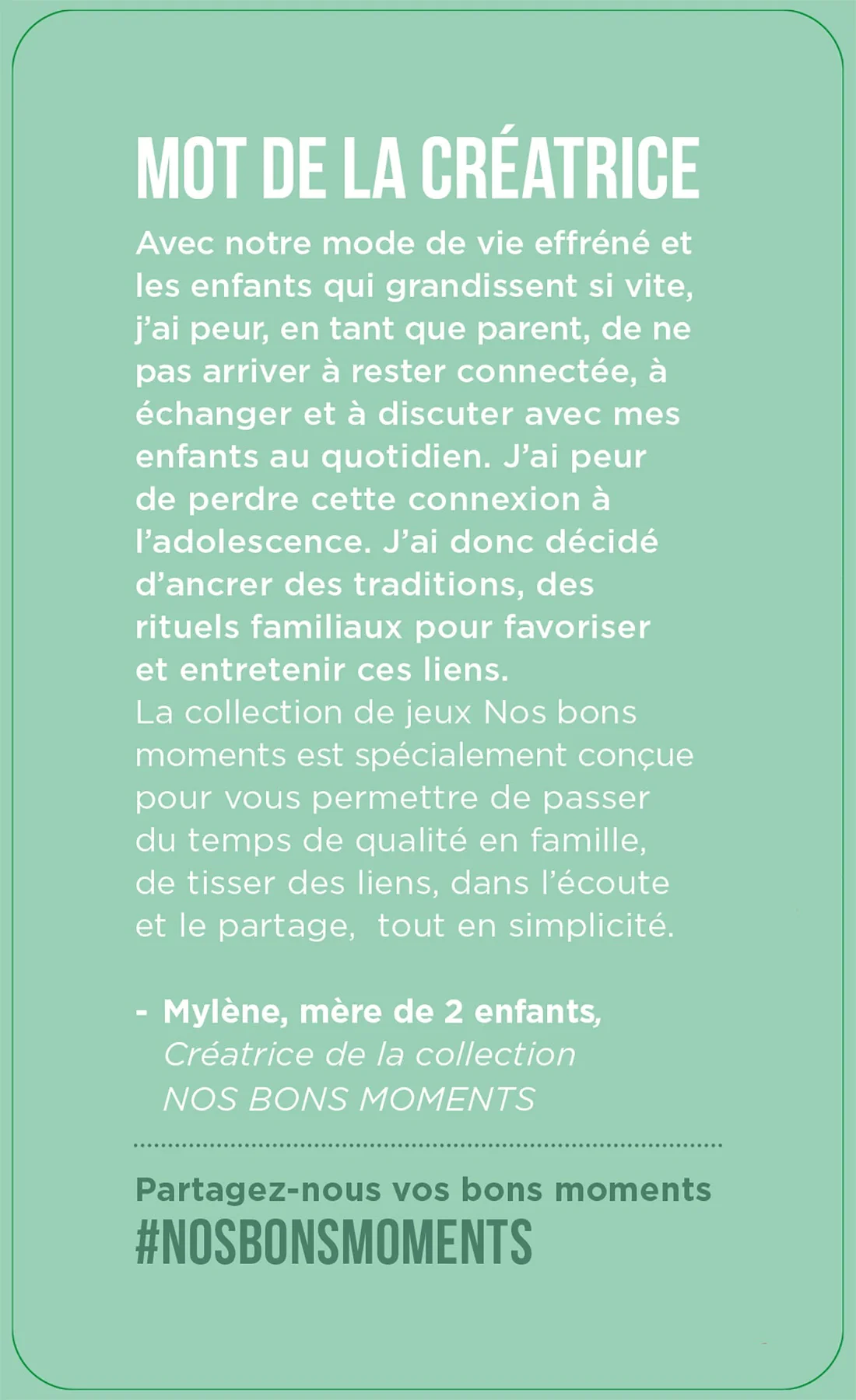 This game is the perfect tool to transform everyday meals into genuine moments of pleasure and family connection. Easy to use, compact, and beautifully illustrated, it encourages listening, gratitude, and kindness through 42 cards to discover day after day.
