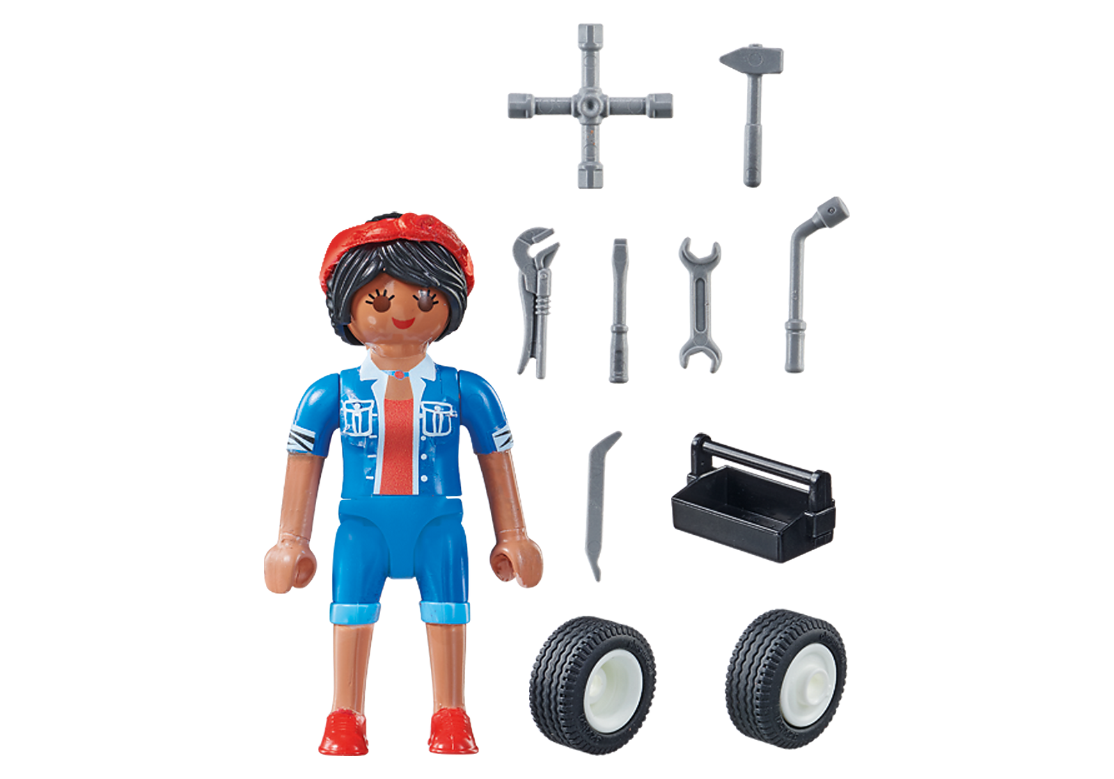 The Playmobil Mechanic Figure is a Special Plus set suitable for children aged 4 and up. The figure wears a mechanic's outfit and comes with two tires, a toolbox, and a set of tools to store inside. It allows children to pretend to repair car wheels, developing fine motor skills, imagination, and role-playing skills.