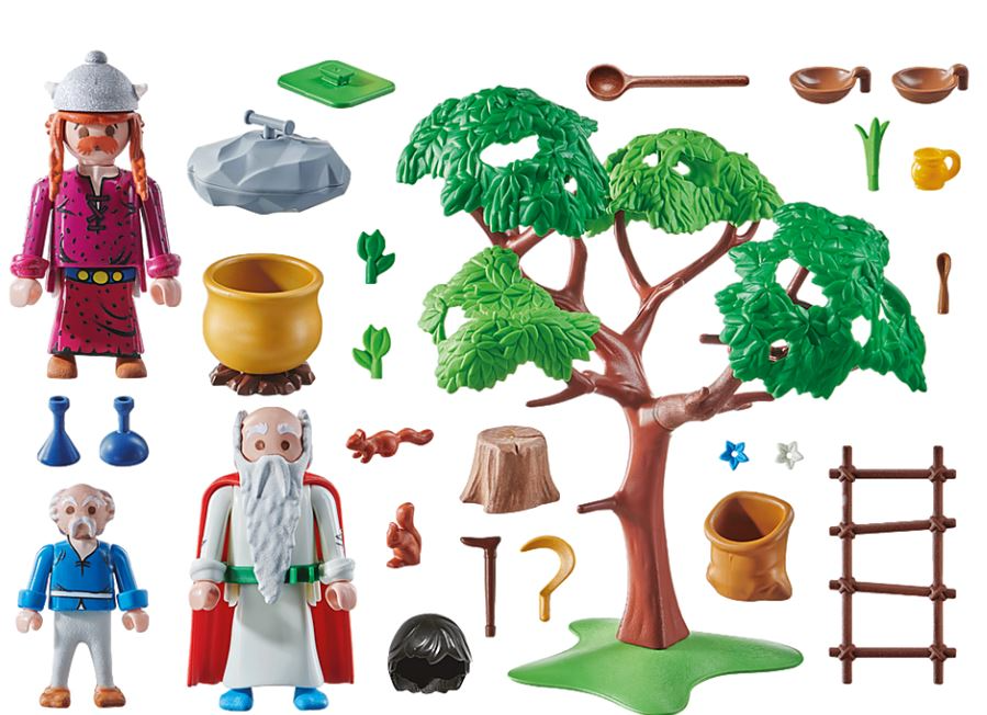 Contents: 3 figures (Panoramix, Agecanonix, Caligula Minus), 1 cauldron, a tree, a stone, many herbs/flowers, and various accessories (bowl, etc.). Total approximately 57 pieces
