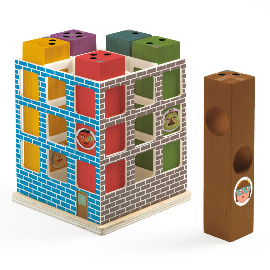 Contents: 1 plastic "hotel building" cube on a wooden base. 6 wooden character sticks. 30 double-sided challenge cards (60 challenges). 1 booklet with the rules of the game in 10 languages and the solutions