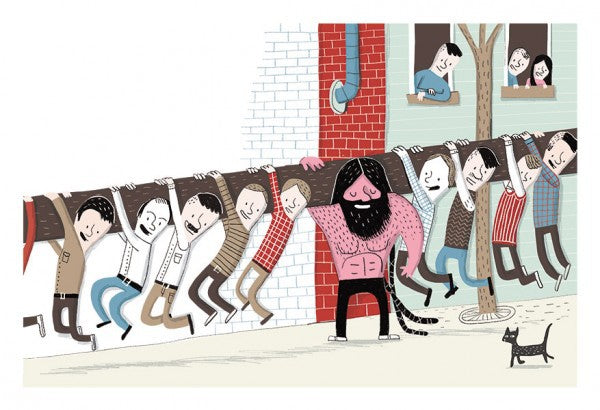 Le Grand Antonio, written and illustrated by Élise Gravel, pays tribute to Antonio Barichievich, a legendary Montreal strongman capable of superhuman feats, such as pulling crowded buses with nothing but his hair or taking on Japanese champions. The book combines absurd humor, sensitivity, and dynamic graphics, offering children a real and endearing hero figure while evoking human fragility. Élise Gravel's unique visual style, blending lively lettering and retro colors, adds emotional depth to the story.
