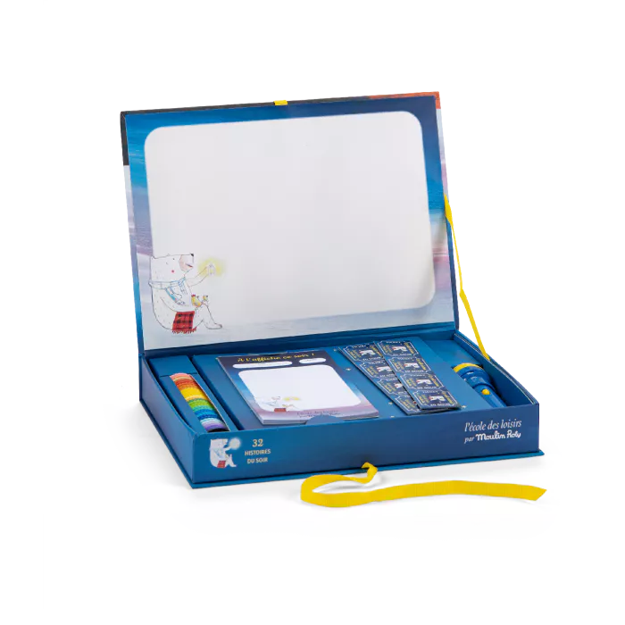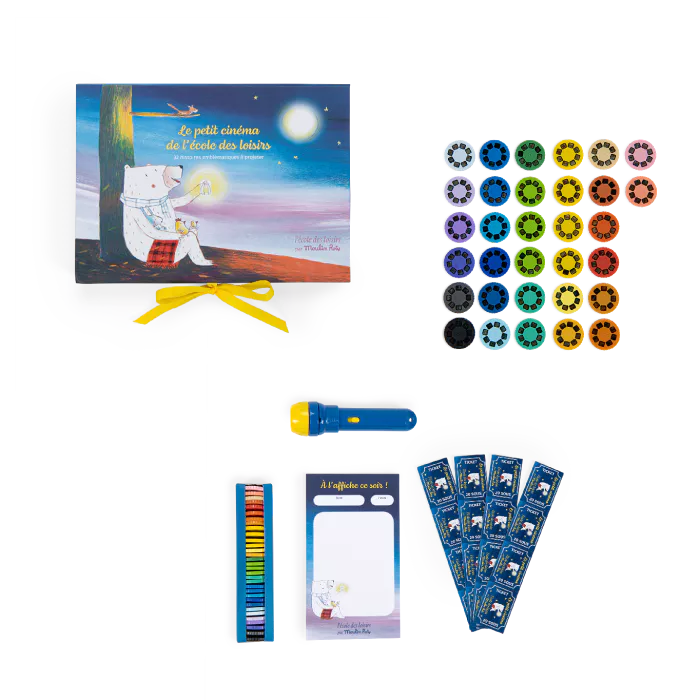 Settle in comfortably: bring the cinema home! This magnificent deluxe box set from Moulin Roty in collaboration with École des Loisirs brings together 32 iconic stories ready to be projected thanks to the integrated lamp and slide discs. A magical experience to share with family or friends, suitable for ages 3 and up.