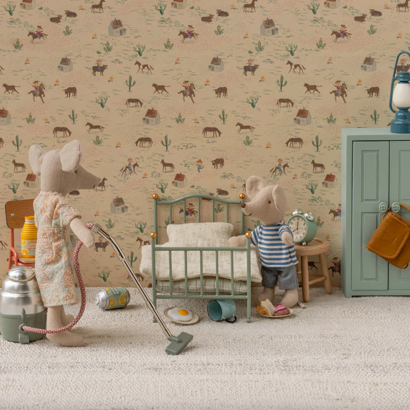 Immerse yourself in Maileg's magical world with this mint-colored single bed, specially designed for little mice. It comes with a soft bedding set (mattress, pillow, and blanket) made of printed cotton, perfect for nights filled with miniature dreams. This bed is ideal for a dollhouse bedroom or mouse house, adding a delicate pastel touch and vintage charm.