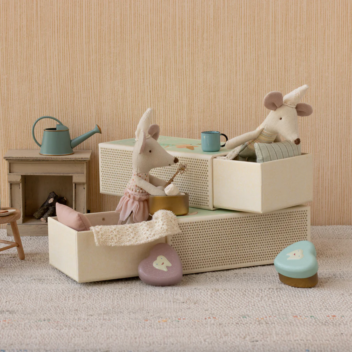 Meet Maileg's Little Sister Tooth Fairy Mouse, ready to take baby teeth under the pillow and leave a little surprise! At night, she unfolds her magic wand to collect teeth and bring a gift, while during the day, she rests in her matchbox, surrounded by her soft linen. A magical companion to accompany children in this important stage of their growth.