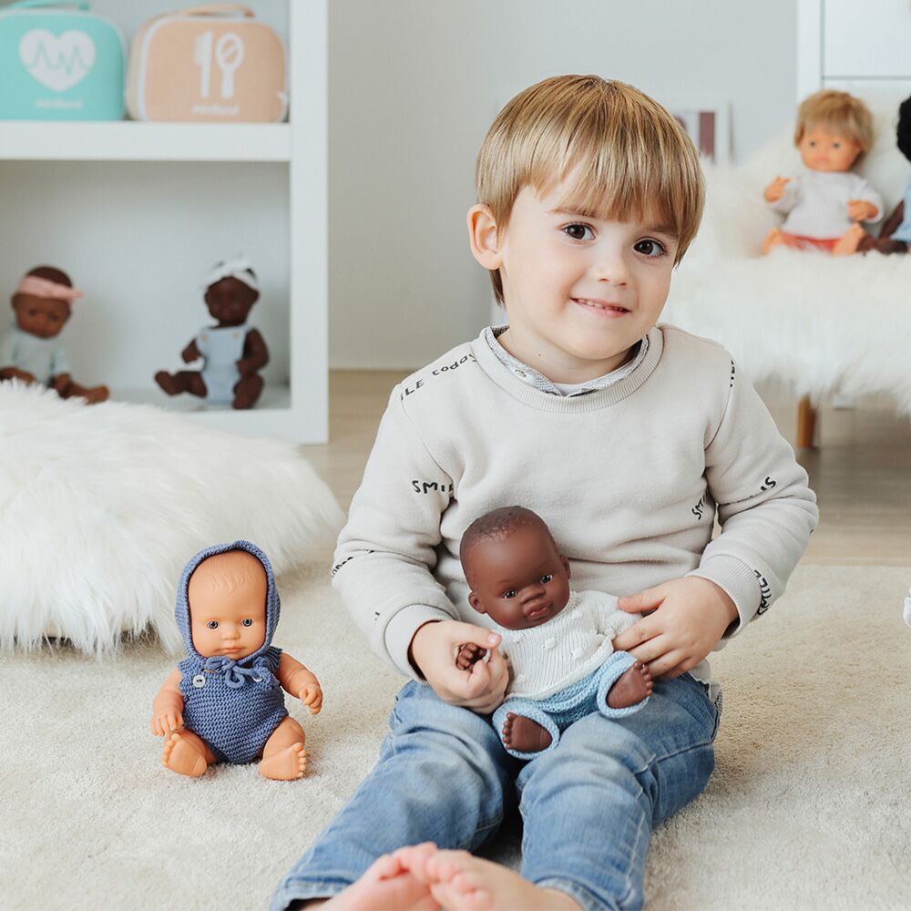 Give your 21cm Miniland doll a soft and cozy outfit with this knitted set, including pants and a matching sweater. Designed to stimulate children's imaginations and develop fine motor skills, this set is ideal for role-play and learning how to dress up.