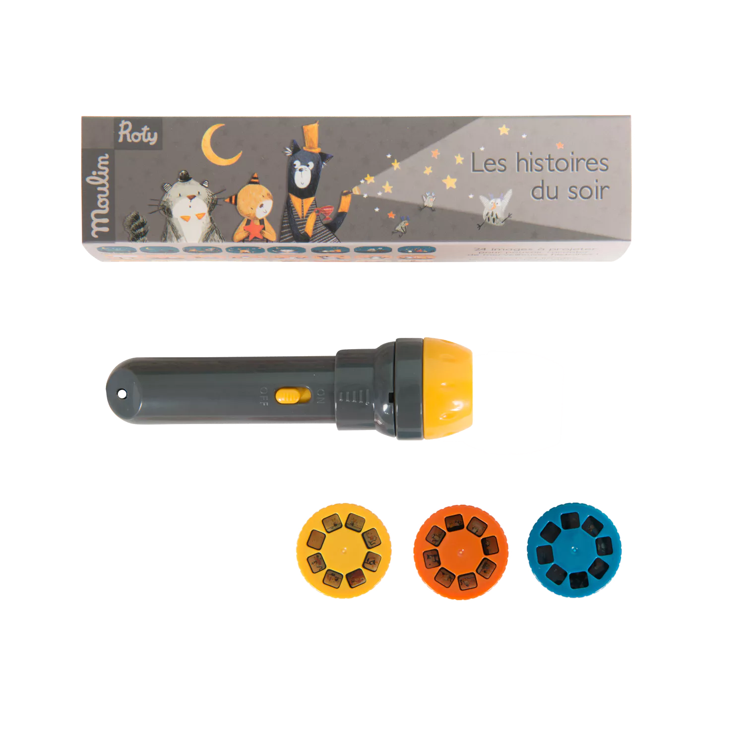 Immerse yourself in a magical world with the Moulin Roty set of 18 story lamps: a true treasure trove of imagination for little (and big!) storytellers. Each lamp, inspired by Moulin Roty's gentle and nostalgic worlds, projects colorful images onto the wall or ceiling, inviting your child to invent magical stories.