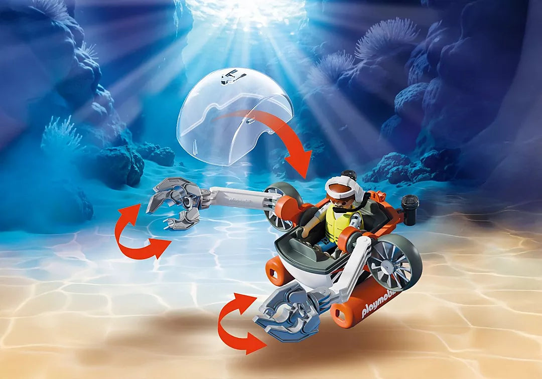 Contents: 1 floating submarine with removable dome and prehensile arms, 1 articulated hammerhead shark, 1 diver figurine with headset and microphone, 1 treasure chest + gems and coral accessories