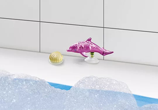 Dive into a magical underwater world with the Playmobil Mermaid with Dolphins set, from the Princess Magic collection. This set includes a graceful mermaid, a mother dolphin and her baby, and a seascape with coral, shells, a rock, and a basket of accessories. The dolphins can swim and land thanks to their movable fin and suction cups for smooth surfaces. The mermaid is poseable, with removable arm cuffs and hair extension, and can stand or sit. A magical world perfect for imaginative play or bath time.