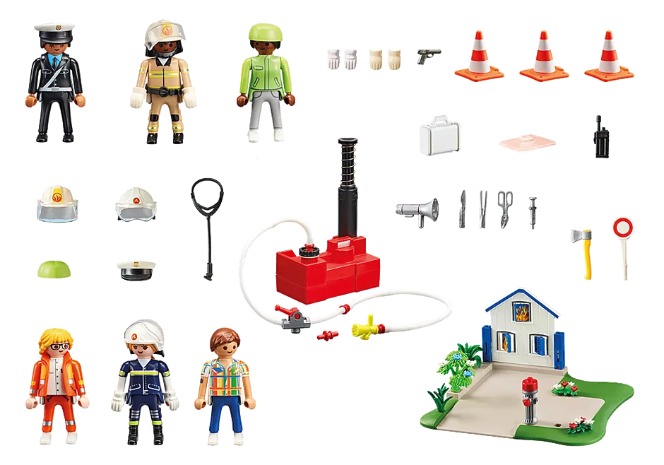Contents: Set comprising 120 pieces including 6 figurines to assemble, various accessories (helmets, emergency equipment, signaling objects), a house or emergency scene set, and elements for emergency missions (water pump, hose, etc.)