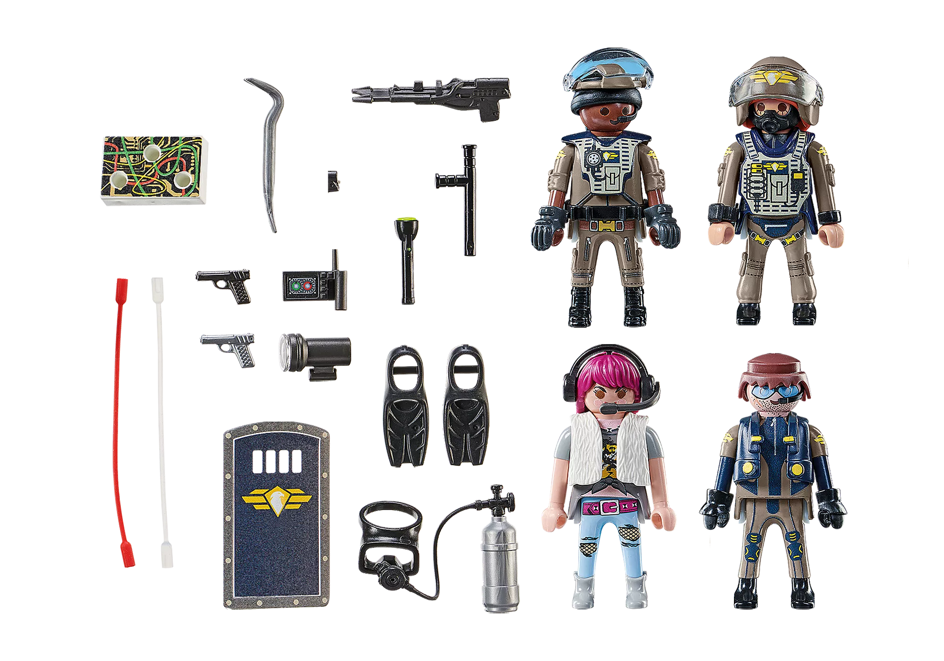 Contents: 4 figures (3 special forces and 1 criminal), 37 accessories including removable helmets, belts, pistols, shield, diving equipment