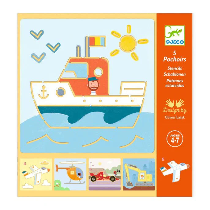 Unleash your child's creativity with this "Transports & Co" set from Djeco: a box containing 5 carefully printed stencils, each illustrating a mode of transport (truck, plane, boat, helicopter, race car). Well-designed slots guide the pencil for easy and precise tracing.