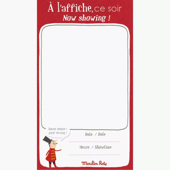 Cinema at home, ask for the program! Cinema box set including a block of programs, detachable cinema tickets, a flashlight and five discs, each with eight images, to fit together. Each of the discs projected on the wall tells a story in color:- 1: Arthur, valiant knight: He saves his beautiful princess from the flames of the evil dragon- 2: Thief!: Two policemen in the city are on his tail, but the thief manages to escape by flying away, hanging on to balloons- 3: Super hero: He flies to the rescue of a granny caught in the flames of a building- 4: Sacred cowboy: He becomes the hero of his family, by learning to control his mount, a rebellious horse- 5: Band of pirates: On a deserted and volcanic island a pirate ship docks to discover the magnificent treasure. But oh surprise! There is only one apple left inside the chest. Illustrations in a very 50s style, a little Jacques Tati style... Enjoy!