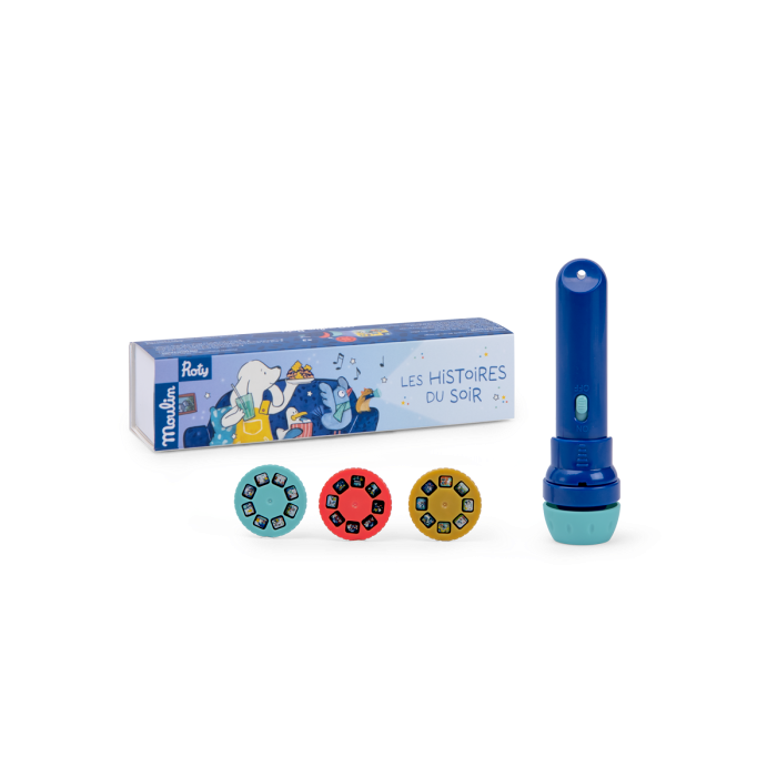 Tell stories before bed with the “Puce & Pilou” story lamp from Moulin Roty, a small pocket projector designed for children aged 4 and up. Slide in one of the 3 illustrated discs, turn on the lamp, and project up to 3 stories of 8 images onto the walls or ceiling. Compact and lightweight, this ABS plastic torch offers easy focusing for moments of complicity and wonder.