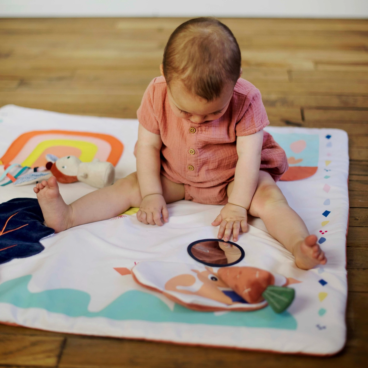 The Gabin Rabbit play mat from Ebulobo is a soft sensory world designed to delight babies from birth. With its generous dimensions of 80 x 80 cm, it offers a comfortable space for their first explorations. The bright colors, varied textures, and interactive elements captivate baby's attention while stimulating their sensory development.