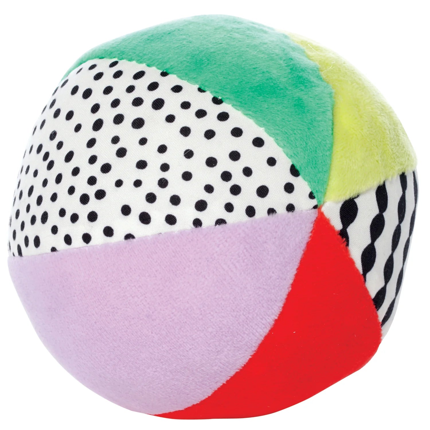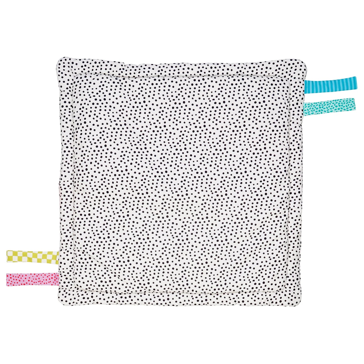 Give your baby a sensory exploration playground from birth with the Wimmer Seek & Explore mat from Manhattan Toy. This double-sided mat combines high-contrast black and white polka dot patterns with a colorful, textured side featuring ribbons, crinkle flaps, a removable mirror, and teething rings to stimulate sight and touch. It's all designed to gently encourage tummy time.
