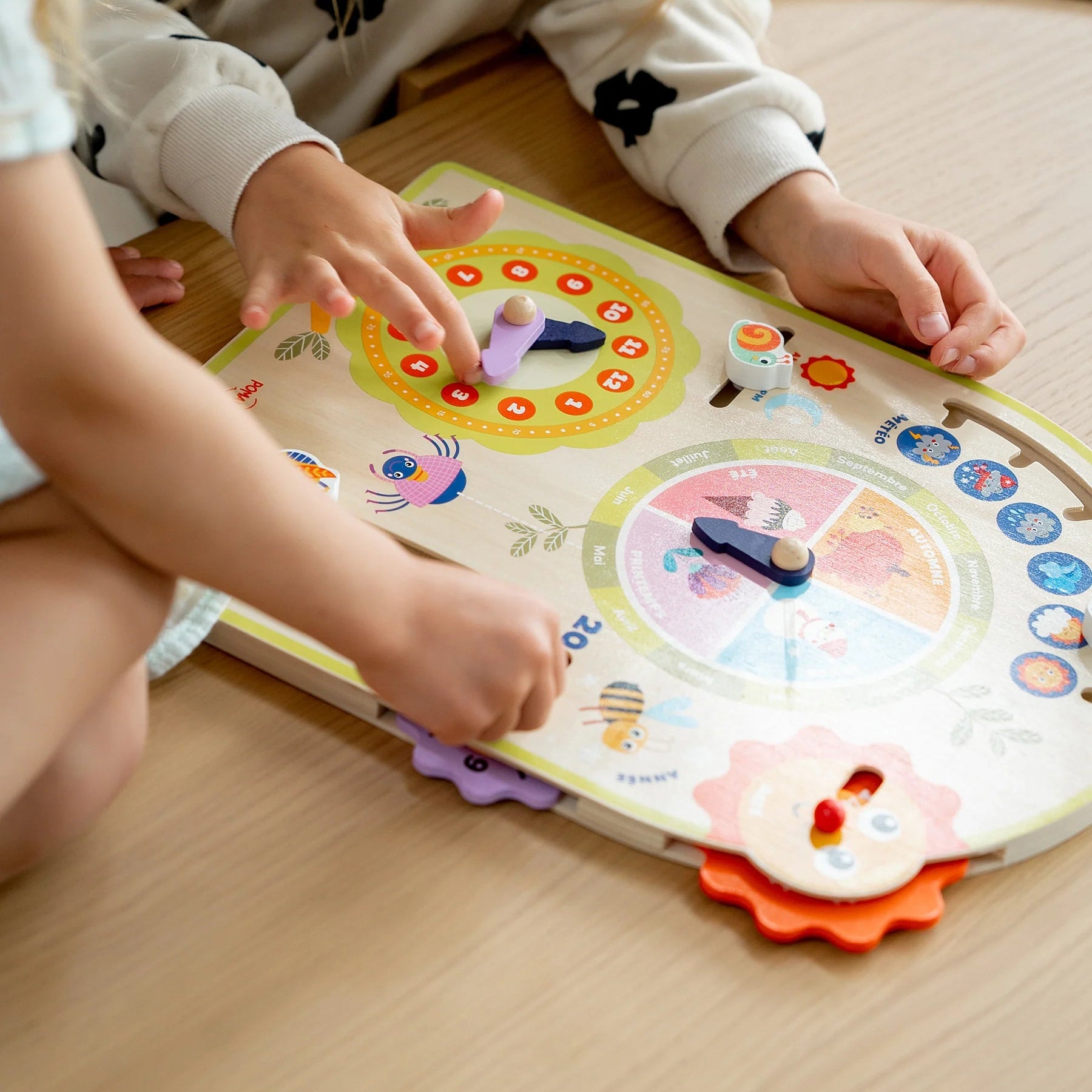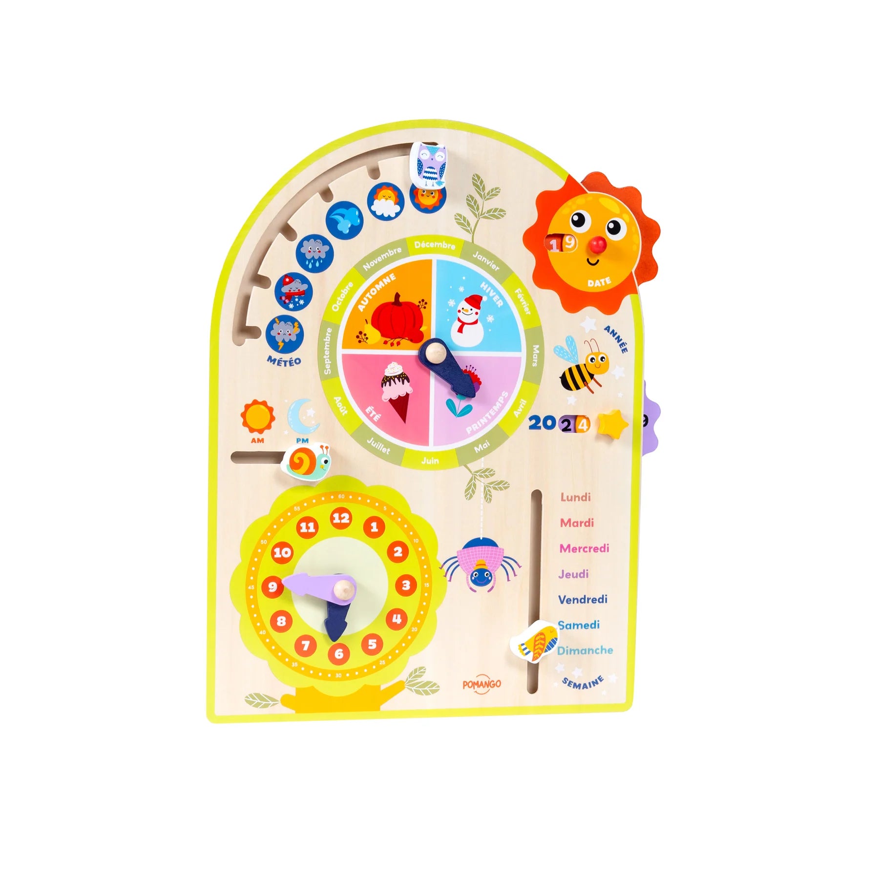 Hang it on the wall and let the magic of time become part of everyday life! This perpetual wooden calendar by Pomango transforms learning about days, months, seasons, and the weather into a fun and interactive experience. Children can manipulate the arrows and pictograms (little owl, snail, star, etc.) to follow the passage of time while developing their independence.