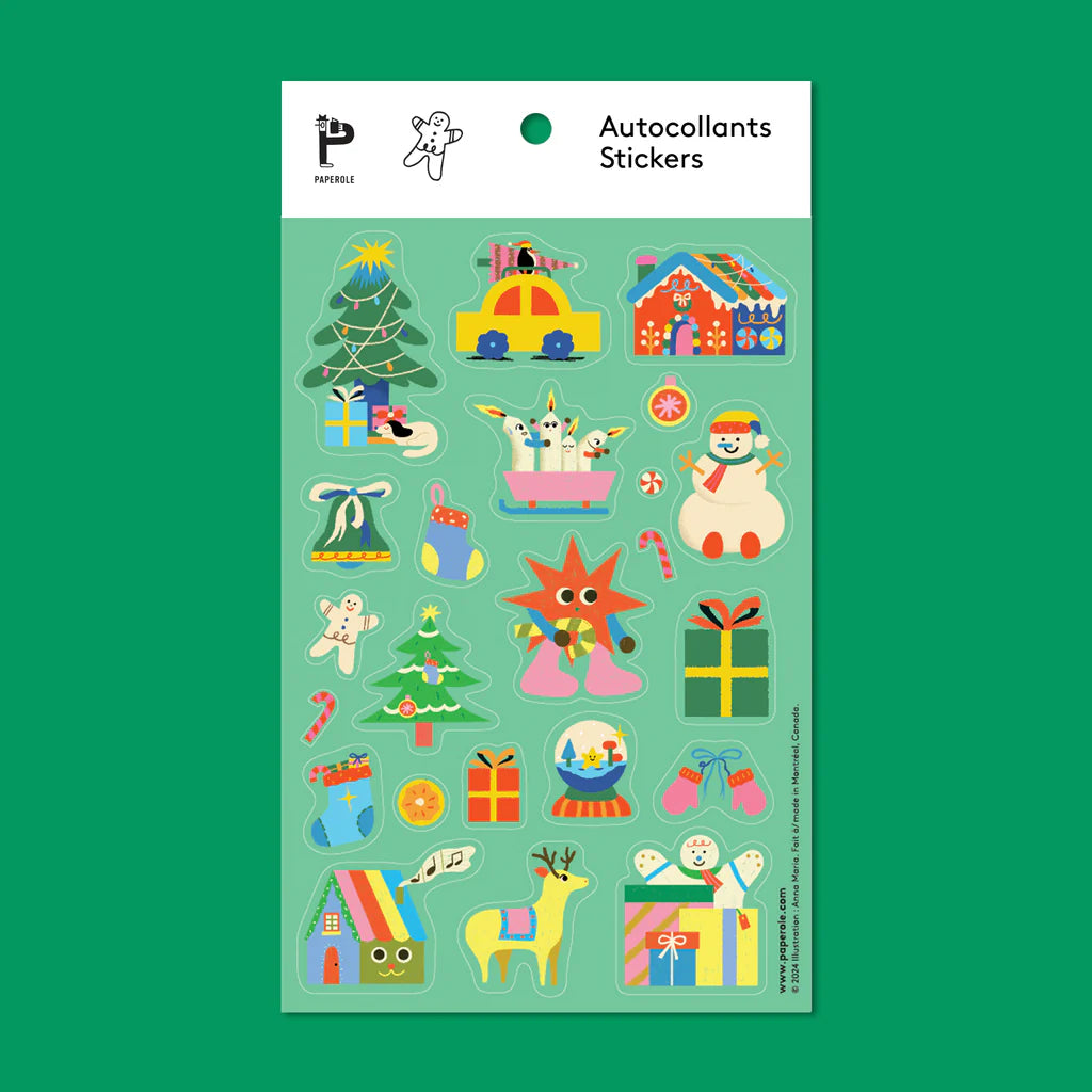 Ajoute une touche de magie aux Fêtes avec la feuille d’autocollants Festivités de Paperole. Illustrée par Anna Maria dans un style joyeux et coloré, cette planche de 23 autocollants capte l’esprit des célébrations montréalaises, parfait pour décorer tes enveloppes, cartes ou cadeaux.