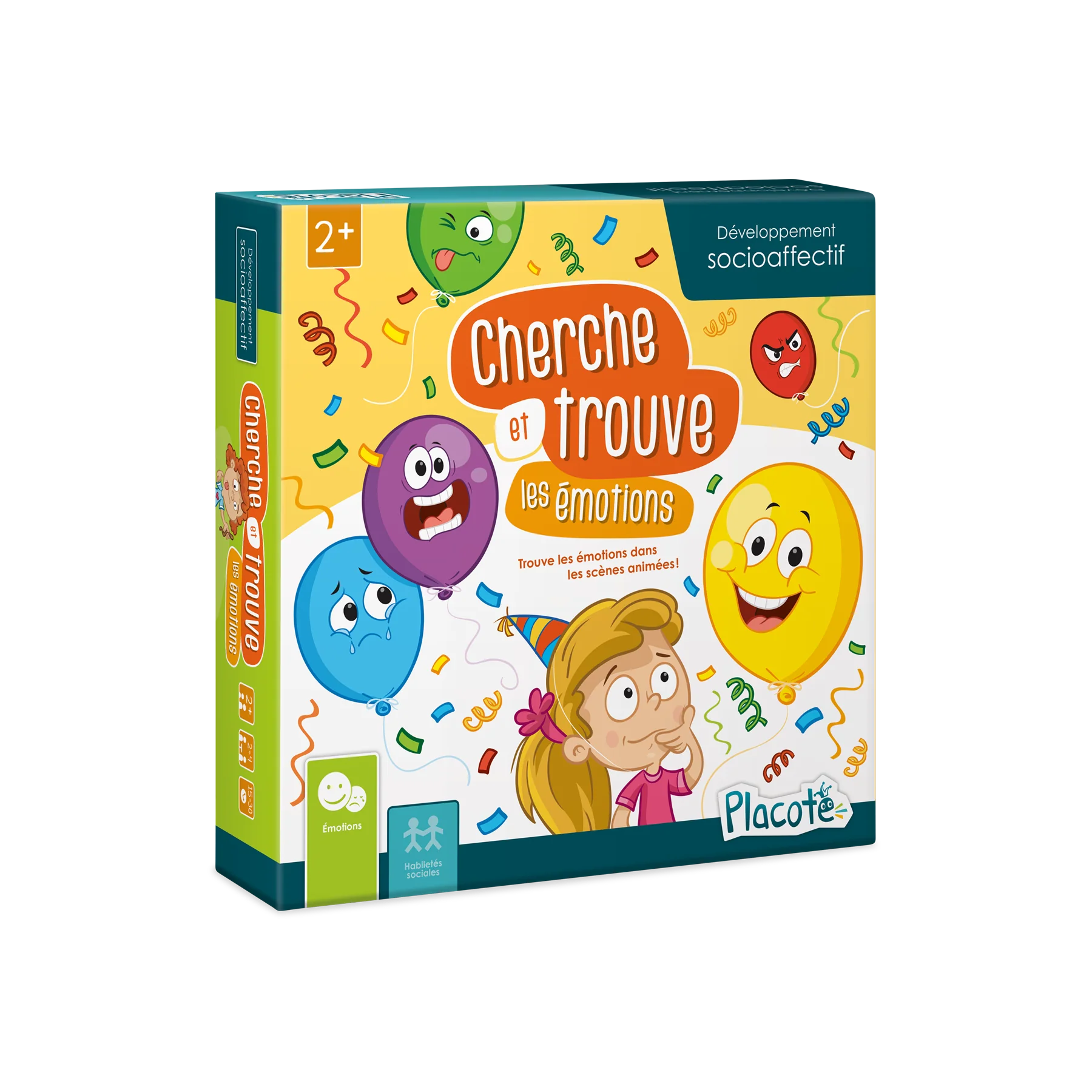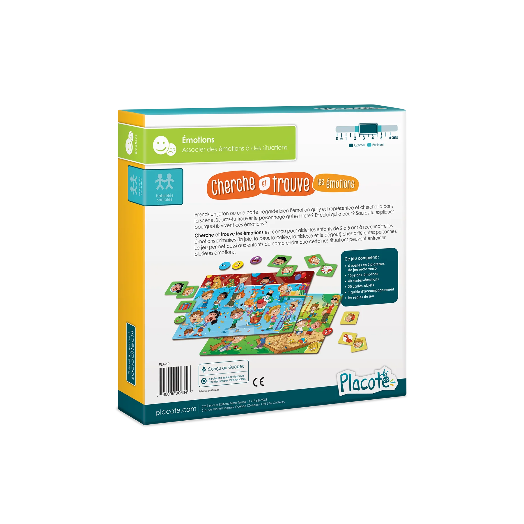 Le jeu éducatif cherche et trouve les émotions de Placote est spécialement conçu pour aider les enfants de 2 à 5 ans à reconnaître et à comprendre les émotions primaires telles que la joie, la peur, la colère, la tristesse et le dégoût. À travers des scènes illustrées de la vie quotidienne, les enfants sont invités à associer des émotions à des situations spécifiques, favorisant ainsi leur développement socioaffectif. Ce jeu stimule également l'observation, la réflexion et le langage chez les tout-petits. Il est idéal pour des moments de jeu en famille ou en milieu éducatif.