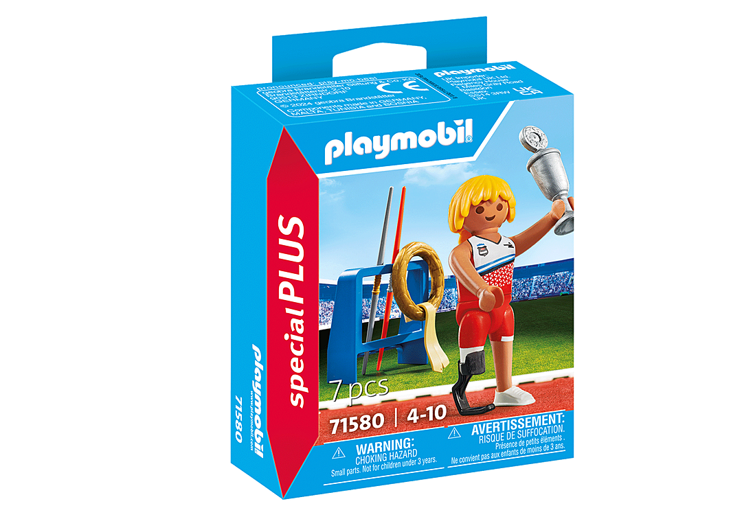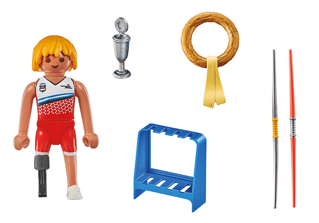 Contenu : 1 figurine d'athlète paralympique avec prothèse, 2 javelots, 1 support pour javelots, 1 trophée