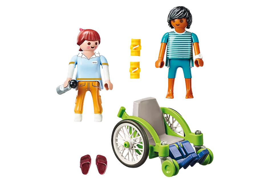 Contenu : 2 figurines (infirmière et patient), 1 fauteuil roulant avec repose-pieds rabattable, 2 attelles réglables, 1 paire de chaussures pour patient et 1 gourde