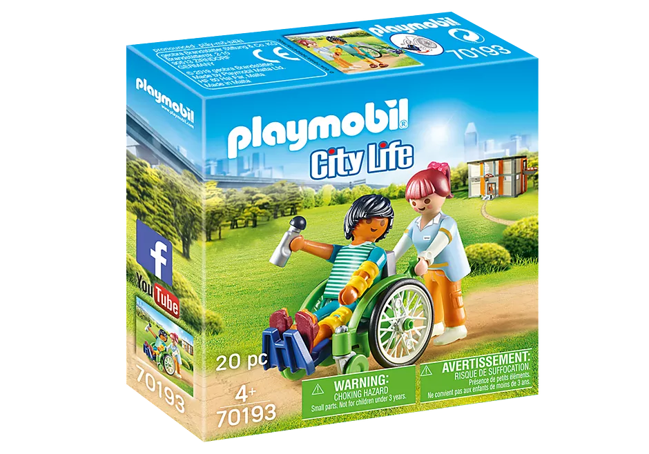 Le set patient en fauteuil roulant (City Life) de Playmobil met en scène une infirmière accompagnant un patient en promenade avec un fauteuil roulant réaliste équipé d’un repose-pieds rabattable. L’attelle ajustable pour les bras et les jambes permet une mise en scène immersive, renforçant l’aspect soin et accompagnement. Avec ce set, les enfants développent leur empathie et leur imagination à travers le jeu narratif.