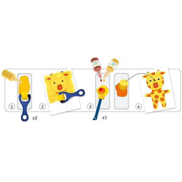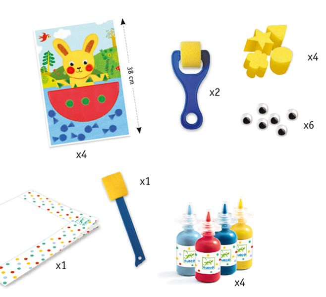 Contenu : 4 grandes cartes illustrées, 8 planches avec formes à détacher, 4 bouteilles de gouache (30 ml), 2 rouleaux, 1 pinceau, 4 éponges, 6 yeux mobiles, 1 nappe de protection, barquettes/mélange, livret explicatif