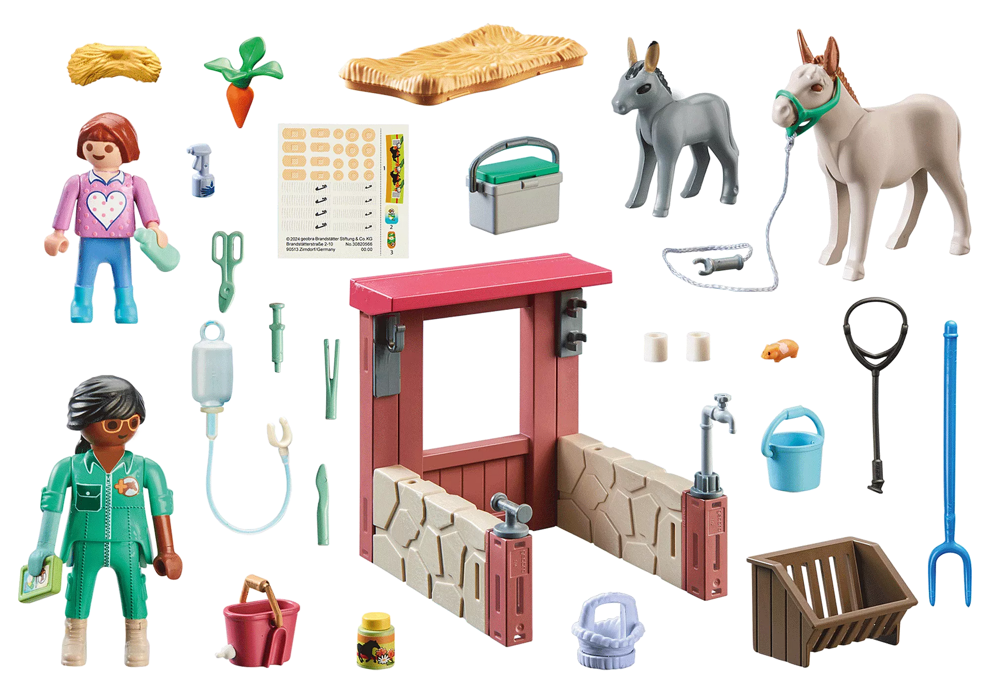 Contenu : vétérinaire, jeune aide, âne adulte, poulain, petit hamster, équipement médical et accessoires variés
