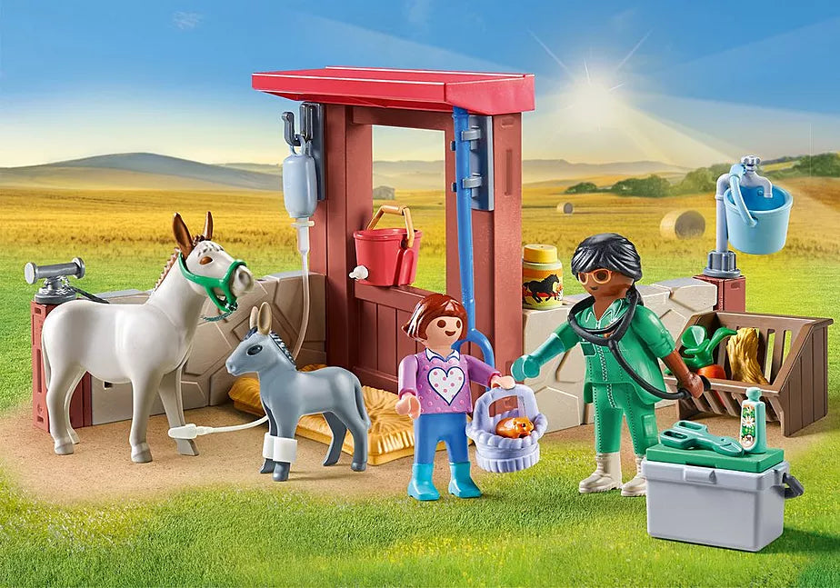 Avec ce pack Playmobil Vétérinaire avec animaux de la ferme, les enfants plongent directement dans une aventure de soins animaliers pleine de tendresse et d’imagination ! Ce set amusant met en scène une vétérinaire et une aide passionnée par les animaux, en train de prendre soin d’un âne blessé et de son petit dans l’étable, avec équipements et accessoires réalistes pour jouer le rôle de soigneur en herbe.