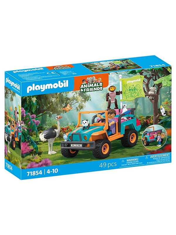 Contenu : 1 personnage (explorateur), 1 véhicule tout-terrain, 7 animaux (autruche, singe, bébé panda, lémurien, maman koala et son petit, oiseau, papillon), 1 arbre, 1 nid, 1 bidon d'essence et des accessoires de sécurité.