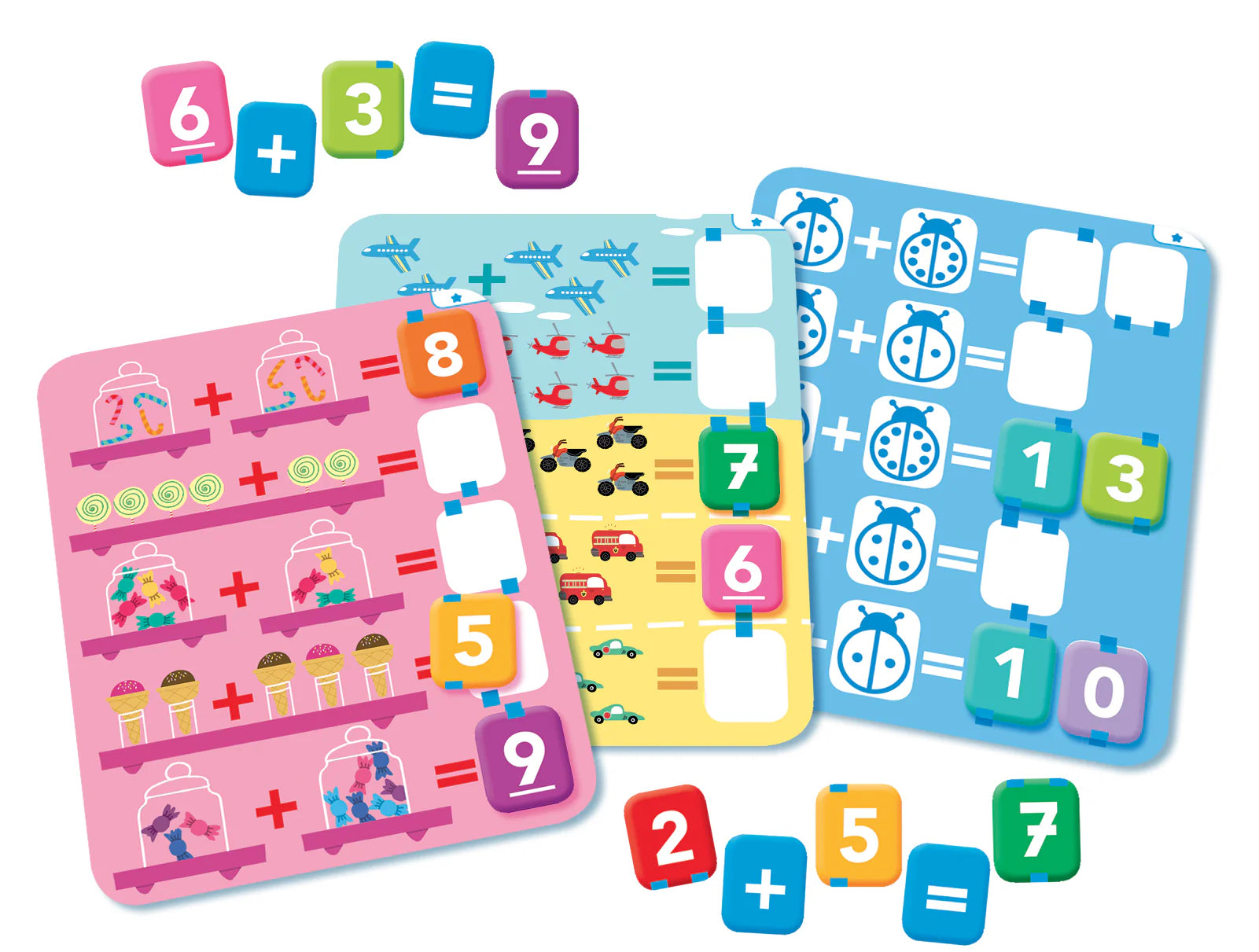 Apprendre à compter et à additionner n’a jamais été aussi simple ! Avec le coffret "Premières Additions", les mathématiques deviennent un véritable terrain de jeu. Conçu pour accompagner les enfants dès 5 ans dans leurs premières découvertes numériques, ce jeu propose 6 activités progressives et ludiques. L'enfant commence par dénombrer des objets concrets sur une carte, puis s'initie progressivement à trouver le chiffre manquant d'une opération ou le résultat final d'une addition.