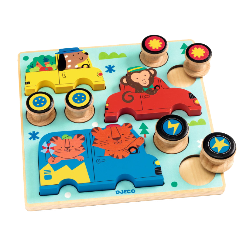 Contenu : 1 puzzle en bois avec 9 pièces encastrables, 3 véhicules mobiles (roues) à associer aux animaux de même couleur