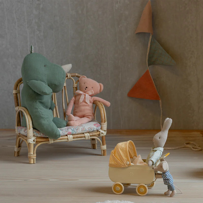 Voici le rhinocéros Maileg « Safari Friends » en couleur sauge, version medium — une peluche pleine de douceur et d’imagination. Avec sa texture en ramie/lyocell, il est incroyablement agréable au toucher, invitant à la caresse et aux câlins.