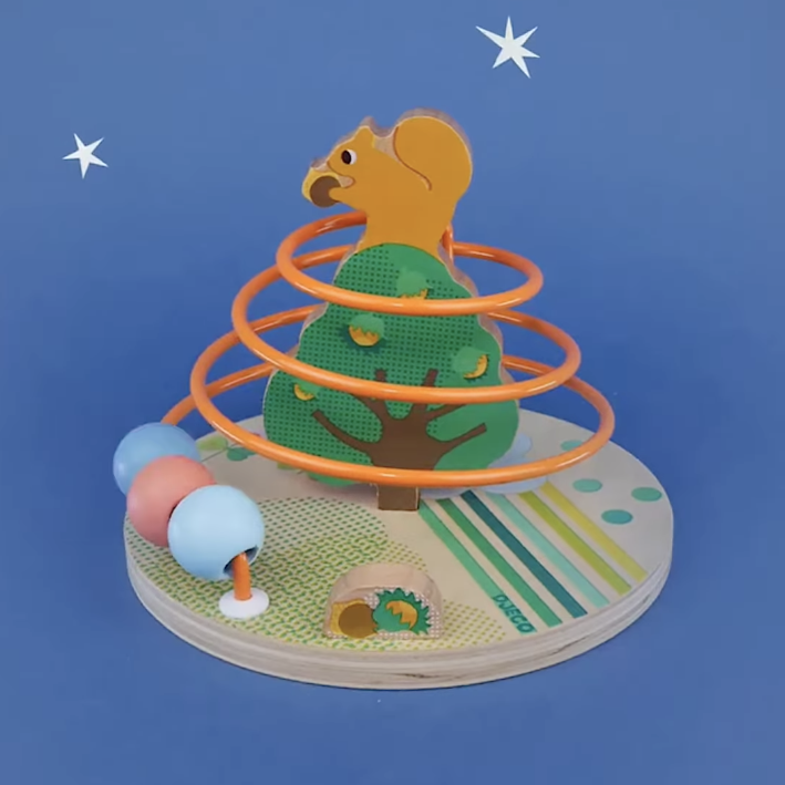 RollNut est un boulier en bois destiné aux enfants à partir de 18 mois. Il se compose d’une tige métallique en forme de cône sur laquelle 4 perles se déplacent. L’enfant s’amuse à faire glisser, tourner, monter, redescendre les perles de différentes couleurs dans un mouvement circulaire tout au long de la tige pour relier l’écureuil à ses noisettes.