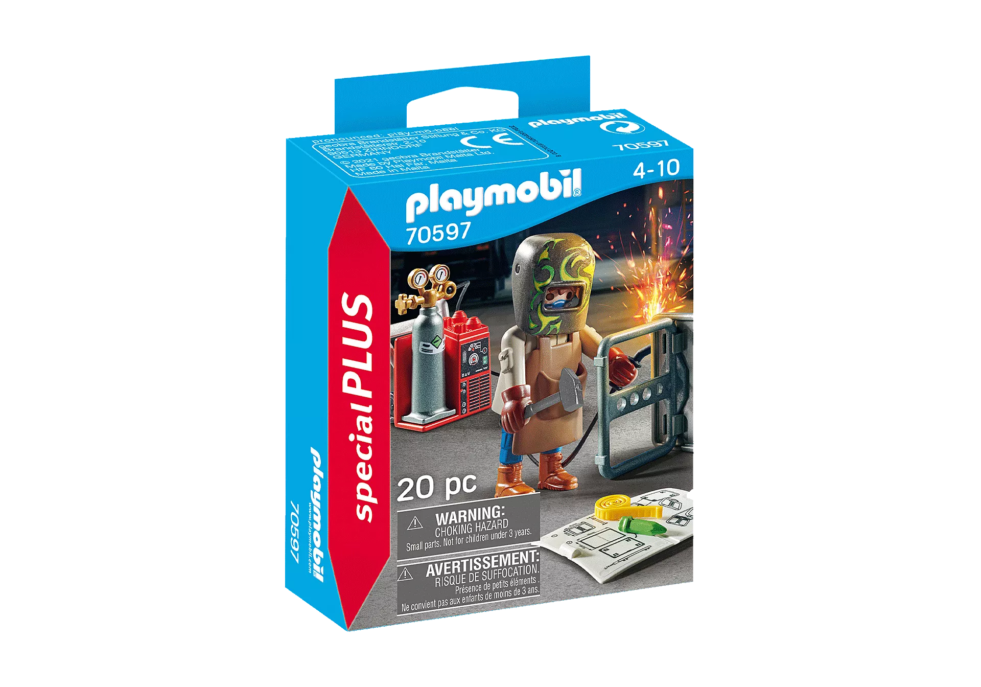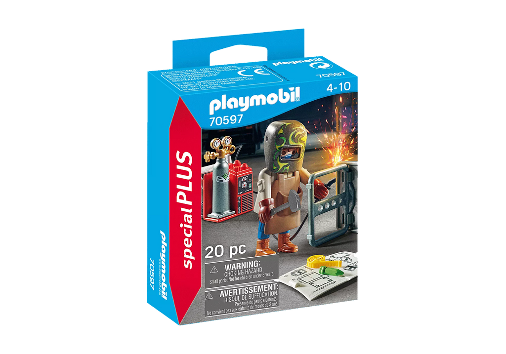 Ce soudeur est bien équipé : gants, masque de soudure, table, outils, machine à souder, tablier Rien ne manque ! Contient un personnage.